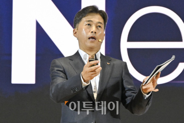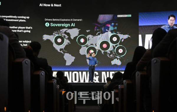 ▲정재헌 SK텔레콤 신임 최고경영자(CEO)가 3일 서울 강남구 코엑스에서 열린 SK AI SUMMIT 2025 키노트 세션에서 AI 인프라 전략의 NEXT를 주제로 발표를 하고 있다. 조현호 기자 hyunho@