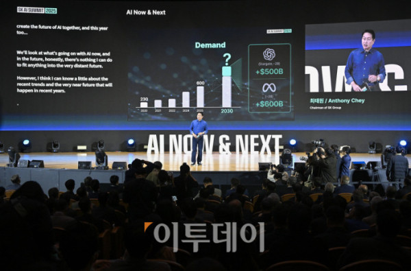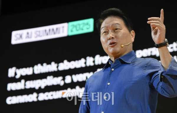 ▲최태원 SK그룹 회장이 3일 서울 강남구 코엑스에서 열린 SK AI SUMMIT 2025 키노트 세션에서 AI Now & Next를 주제로 기조연설을 하고 있다. 조현호 기자 hyunho@