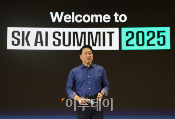 최태원 SK그룹 회장이 3일 서울 강남구 코엑스에서 열린 SK AI SUMMIT 2025 키노트 세션에서 AI Now & Next를 주제로 기조연설을 하고 있다. 조현호 기자 hyunho@