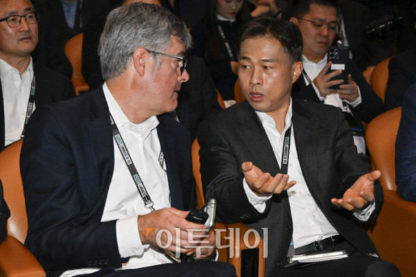 ▲곽노정(오른쪽) SK하이닉스 대표이사 사장이 3일 서울 강남구 코엑스에서 열린 SK AI SUMMIT 2025에서 참석자와 대화를 하고 있다. 조현호 기자 hyunho@