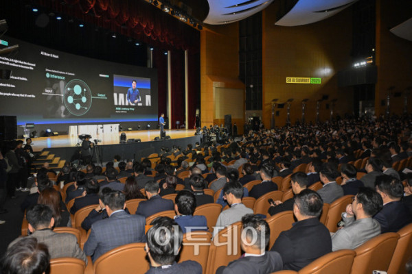 ▲곽노정 SK하이닉스 대표이사 사장이 3일 서울 강남구 코엑스에서 열린 SK AI SUMMIT 2025 키노트 세션에서 SK hynix, New Vision & New Role in AI Era를 주제로 발표를 하고 있다. 조현호 기자 hyunho@