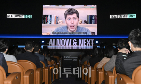 ▲샘 알트만 오픈AI CEO가 3일 서울 강남구 코엑스에서 열린 SK AI SUMMIT 2025 키노트 세션에서 영상으로 발표를 하고 있다. 조현호 기자 hyunho@