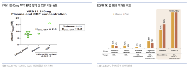 유안타증권에 따르면 AACR, AOS에 이어 ANE에서 VRN11의 추가적인 임상 결과를 공개했다. VRN11은 400mg 코호트까지 grade 3 이상 부작용을 보이지 않으면서 내약성 확인됐다. 처음으로 임상 환자의 CSF 내 약물 농도를 공개했으며, 혈중 농도 대비 2배 수준의 CSF 내 약물 농도가 확인됐다. 마우스 등 동물 모델에서 보여준 우수한 BBB 투과도를 인간에서 재확인됐다.
