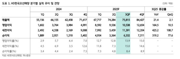 전날 HD한국조선해양은 올 3분기 연결기준 매출액 7조5815억 원, 영업이익 1조538억 원을 기록했다고 밝혔다. 전년 동기 대비 각각 21%, 164% 증가한 수준이다.