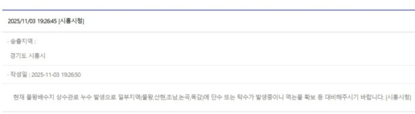경기 시흥시 일부 지역에서 상수관로 누수로 인해 수돗물 공급이 중단되거나 탁수가 발생해 주민들이 불편을 겪고 있다. 시흥시에 따르면 3일 오전 10시께부터 목감동과 물왕동을 중심으로 단수와 흐린 물 현상이 이어졌으며 산현·조남·논곡동 일부 가구에서도 같은 문제가 발생했다. 시는 물왕배수지 인근 상수관로 누수가 원인이라고 설명했다. 복구 작업은 오후 2시께부터 진행돼 수리는 완료됐으나 내부 공기 제거 작업이 이어지고 있어 정상 공급까지는 시간이 더 걸릴 전망이다. 시는 안전재난문자를 통해 단수와 탁수 사실을 알리고 “먹는 물을 미리 확보해 달라”고 당부했으며 급수차를 투입해 주민 불편을 최소화하고 있다.