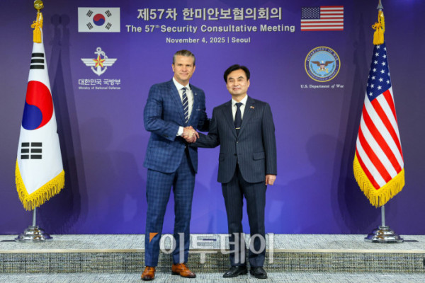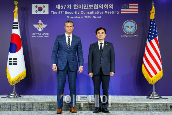▲안규백(오른쪽) 국방부 장관과 피트 헤그세스 미국 국방부 장관이 4일 서울 용산구 국방부 청사에서 제57차 한미안보협의회의(SCM)에 앞서 기념촬영을 하고 있다. 사진공동취재단