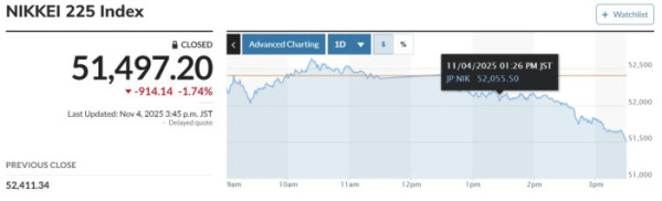 이날 마켓워치에 따르면 일본 증시 대표 주가지수인 닛케이225 평균주가(닛케이)는 전 거래일 대비 914.14엔(1.74%) 내린 5만1497.20으로 마감했다. 기술주 중심의 토픽스 역시 21.69포인트(0.65%) 내린 3310.14에 거래를 마쳤다.