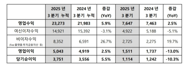 3분기 누적 여신이자수익은 1조4921억 원으로 지난해보다 3.1% 줄었다. 3분기 순이자마진(NIM)은 1.81%로 전 분기 대비 0.11%포인트(p) 축소됐다.