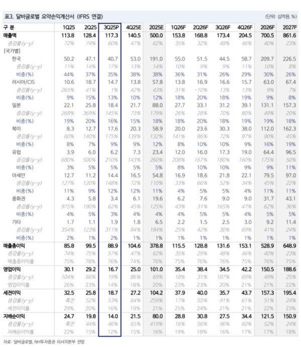정 연구원은 “3분기 울타(ULTA‧19억 원), 4분기 코스트코(28억 원) 북미향 초도 물량 매출 인식 시작으로 내년 글로벌 오프라인 매출 큰 폭 증가를 예상한다”고 짚었다. 그러면서 “2026년 화장품 업종 내 상대적으로 높은 외형 성장률이 예상되는 종목임을 감안해 주가 하락 시 매수 대응을 권고한다”고 밝혔다.