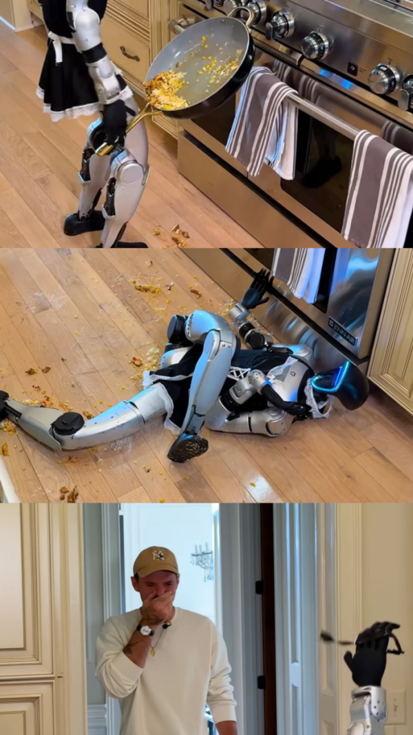 영상 속에서 휘슬린디젤은 G1의 손에 볶음 재료가 담긴 프라이팬을 쥐어주며 “요리를 해달라”고 지시한다. 그러나 로봇은 팬을 제대로 제어하지 못한 채 재료를 바닥에 쏟고, 미끄러운 바닥 위에서 휘청거리다 그대로 넘어졌다.