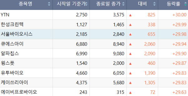 이날 코스닥시장에서는 △YTN △한성크린텍 △서울바이오시스 △큐에스아이 △알파칩스 △윙스풋 △유투바이오 △케이쓰리아이 △에이비프로바이오 등 9종목이 상한가로 거래를 마쳤다. 하한가를 기록한 종목은 없다.