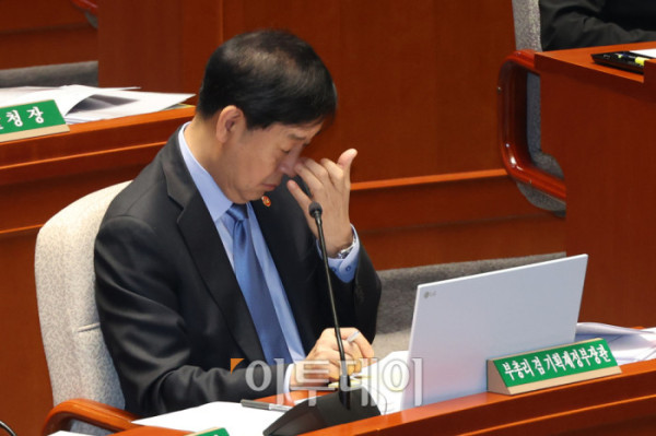 ▲구윤철 경제부총리 겸 기획재정부 장관이 6일 서울 여의도 국회에서 열린 예산결산특별위원회 전체회의에서 얼굴을 만지고 있다. 고이란 기자 photoeran@