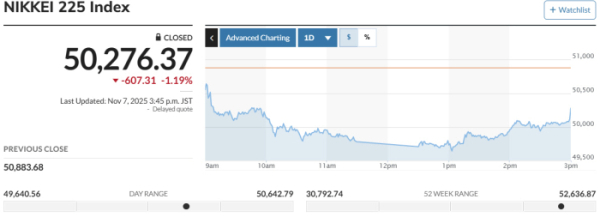 일본증시 닛케이225지수는 전장보다 607.31포인트(1.19%) 밀린 5만276.37에, 토픽스지수는 전일 대비 14.60포인트(0.44%) 내린 3298.85에 각각 장을 마감했다.