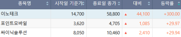 이날 코스닥 시장에서는 △포인트모바일 △싸이닉솔루션이 상한가를 기록했다. 이날 상장한 이노테크는 '따따블'(공모가 대비 4배)를 기록했다.