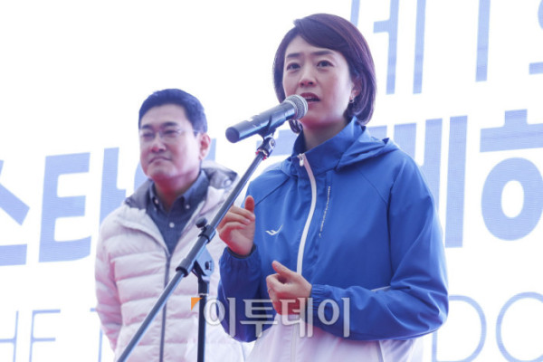 ▲고민정 더불어민주당 의원이 8일 서울 광진구 뚝섬한강공원 수변무대 일대에서 열린 ‘제1회 스타와 함께하는 기부런’ 개막행사에서 축사를 하고 있다. 이투데이가 주최한 이번 행사는 '달리기를 통해 건강과 상생의 문화를 만들자'는 슬로건 아래, 시민들의 일상 속 스포츠 활동을 기부와 연결해 사회적 가치를 창출하기 위해 마련됐다. 평소 많은 기부와 선행을 하며 선한 영향력 확산에 앞장서는 가수 션 등과 시민 5000여 명이 함께한 ‘스타와 함께하는 기부런’ 수익금 일부는 루게릭 환우를 위해 ‘승일희망재단’에 기부된다. 조현호 기자 hyunho@