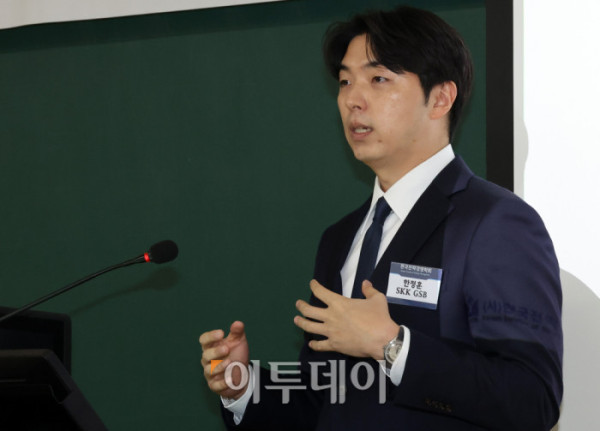 ▲8일 서울 동대문구 서울시립대 미래관에서 열린 2025 한국전략경영학회 추계학술대회 시상식에서 이투데이 신진학자상을 수상한 한정훈 SKK GSB 교수가 발표를 하고 있다. 고이란 기자 photoeran@