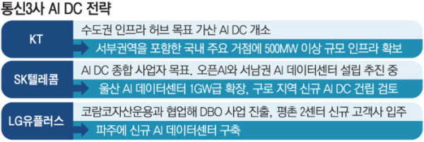 국내 통신3사가 이동통신(MNO) 중심 사업 구조에서 벗어나 ‘AI 인프라 기업’으로의 전환에 속도를 내고 있다. 고성능 그래픽처리장치(GPU) 수요가 폭증하면서 AI 데이터센터(AI DC)가 새로운 성장 축으로 부상했다.