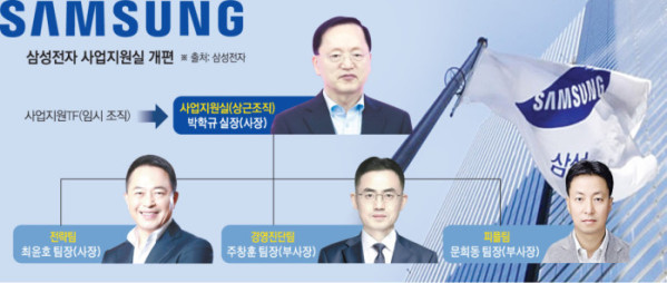 지난 7일 삼성전자는 정현호 사업지원TF장(부회장)을 회장 보좌역으로 위촉하고, 사업지원TF를 ‘사업지원실’로 격상해 박학규 사장을 신임 실장에 임명했다. 조직은 전략팀, 경영진단팀, 피플팀 등 3개 팀으로 재편됐다.