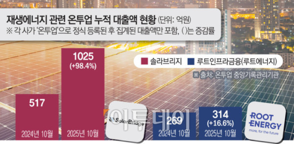 중소형 태양광·풍력발전소 사업자에게 특화된 대출을 제공하는 루트인프라금융(루트에너지) 역시 같은 기간 누적 대출액이 269억 원에서 314억 원으로 16.6% 증가했다.
