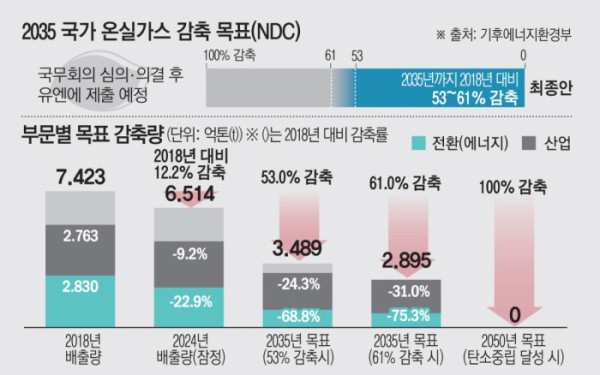 정부가 2035년까지 온실가스를 2018년 대비 최대 61% 감축하는 국가 온실가스 감축목표(NDC)를 확정하면서 산업계가 강력하게 반발하고 있다. 경제계는 정부의 온실가스 감축 목표에 대해 “상당한 부담으로 작용할 것”이라고 우려를 표명했다.