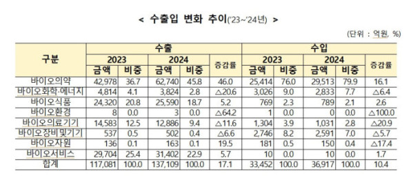 수출 증가세는 더욱 두드러졌다. 2024년 바이오 수출은 13조7109억 원으로 전년 대비 17.1% 상승했다.
