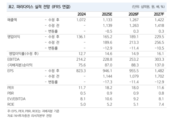 NH투자증권은 11일 파라다이스에 대해 매출 성장 동력은 여전하지만, 구조적 비용 확대 속도가 예상보다 가파르다고 평가했다. 목표주가를 기존 3만 원에서 2만7000원으로 하향하고 투자의견 ‘매수’를 유지했다.