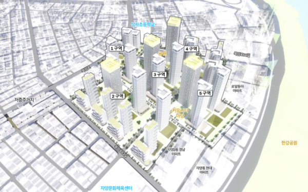 광진구 자양2동은 모아주택 5개소를 통해 2325가구(임대 583가구 포함)를 공급한다. 기존 1424가구에서 901가구 늘어난 규모다. 노후 건축물 비율이 70%를 넘는 지역으로 용도지역 상향과 도로 확폭(최대 14m)으로 주택공급을 활성화한다. 어린이공원(1768㎡)을 신설하고 한강변 도시경관을 고려한 건축한계선 지정으로 열린 조망축을 확보한다.