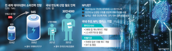 최근 AI 반도체로 주목받고 있는 신경망처리장치(NPU)에 대한 지속적인 육성 정책도 필요하다. NPU는 딥러닝 등 AI 연산에 특화된 반도체다. 현재 주로 쓰이고 있는 그래픽처리장치(GPU)에 비해 범용성은 다소 떨어지지만, 상대적으로 가격이 저렴하고 대량의 연산을 저전력으로 빠르게 처리할 수 있다는 장점이 있다. 퓨리오사AI, 리벨리온 등 국내 신생 팹리스 기업들이 시장 선점을 위해 개발과 양산에 주력하고 있다.
