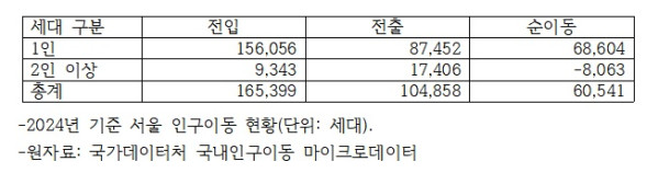 본지가 11일 국가데이터처의 국내인구이동 마이크로데이터를 분석한 결과, 지난해 세대주가 20~39세인 세대 중 6만541세대가 서울에 순유입됐다. 16만5399세대가 전입하고, 10만4858세대는 전출했다.
