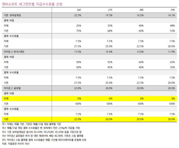 그러면서 “해당 가정 하에서 자체 결제 시스템 도입에 따른 결제 수수료율을 7.5%로 가정해 엔씨소프트의 리니지M, 리니지2M, 리니지W 등 기존 모바일 게임 기준의 결제 비중을 2026년 25%에서 2029년 48%로 증가 적용한 블렌디드 수수료율은 2026년 22.5%에서 2029년 14.1%로 하향 안정화될 것으로 추정 반영했다”고 설명했다.