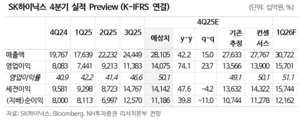 류 연구원은 “4분기 매출액 28조1000억 원, 영업이익 14조1000억 원으로 최대 실적을 이어갈 전망”이라며 “DRAM과 NAND 수요가 모두 강세를 보이고, HBM4는 4분기부터 판매가 시작되지만 본격적인 매출 반영은 내년 2분기부터 가능할 것”이라고 전망했다.
