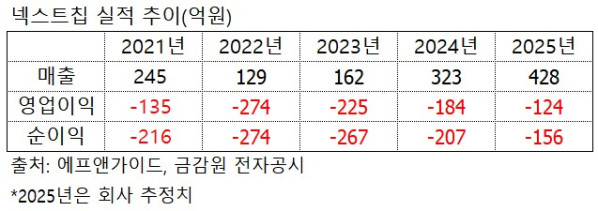 이처럼 대규모 자금 조달에 나선 배경에는 심각한 재무구조 악화가 있다. 앤씨앤의 오토모티브 사업부가 물적분할돼 2022년 상장한 넥스트칩은 외형 성장을 이루고 있으나 매년 수백억 원의 적자를 기록해 왔다. 그 결과 반기 말 현재 자본잠식률이 118.6%를 기록하며 완전 자본잠식 상태에 빠졌다. 이로 인해 코스닥시장본부는 넥스트칩을 투자주의환기종목으로 지정했다. 회사는 6월에도 공모 유상증자를 시도했으나 목표 금액(395억 원) 대비 76억 원 조달에 그쳐 300억 원 규모의 CB 상환 재원 마련에 실패하면서 이번 유증을 추진하게 됐다.