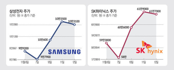 이날 삼성전자와 SK하이닉스는 차익 실현 매물에 소폭 조정을 받았다. 삼성전자는 전 거래일보다 0.39% 내린 10만3100원, SK하이닉스는 0.32% 하락한 61만7000원에 마감했다. 지난 6일부터 11일까지 삼성전자는 9만9200원에서 10만3500원으로, SK하이닉스는 59만3000원에서 61만9000원으로 상승세를 이어왔으나 이날은 숨 고르기에 들어간 모습이다. 최근 1주일간 상승률은 각각 3.9%, 4.1%로 추세는 여전히 견조하다.