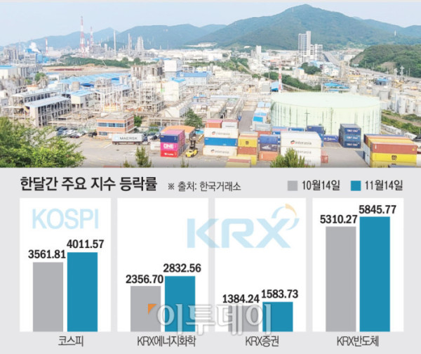 16일 한국거래소에 따르면 정유·화학 대표 지수인 KRX에너지화학지수는 지난달 14일 2356.70에서 이달 14일 2832.56으로 20.2% 상승했다. 같은 기간 코스피는 12.6%, KRX 증권은 14.4%, KRX 반도체는 10.1% 오르며 정유·화학 업종이 주요 산업지수 중 가장 강한 회복세를 보였다.