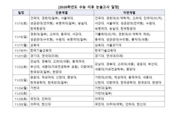 15~16일에는 건국대, 경희대, 고려대, 동국대, 서강대, 성균관대, 숙명여대가 논술고사를 진행한다. 22~23일에는 경북대, 광운대, 덕성여대, 동덕여대, 부산대, 세종대, 이화여대, 중앙대, 한국외국어대, 한양대 등이 시험을 이어 간다. 국민대, 아주대, 인하대는 29~30일에 논술 전형을 실시한다.