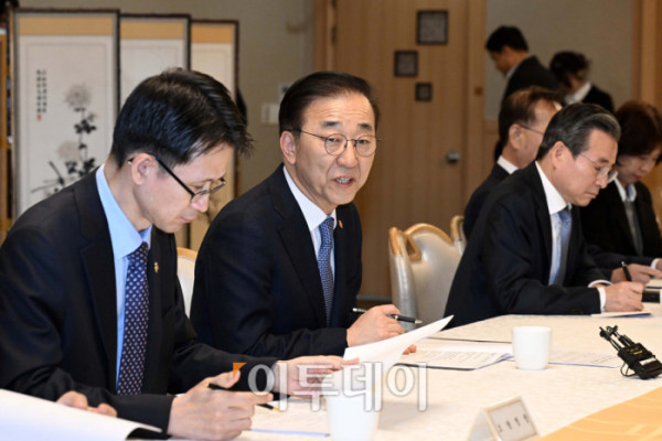 ▲구윤철 경제부총리 겸 기획재정부 장관이 14일 서울 종로구 정부서울청사에서 열린 주택공급촉진 관계장관회의에 참석해 김윤덕 국토교통부 장관을 비롯한 참석자들과 회의 시작에 앞서 대화를 하고 있다. 이날 회의에서는 주택공급촉진 관계장관회의 운영계획과 주택시장 동향 및 주택공급 관련 협조 요청사항이 논의됐다. 조현호 기자 hyunho@
