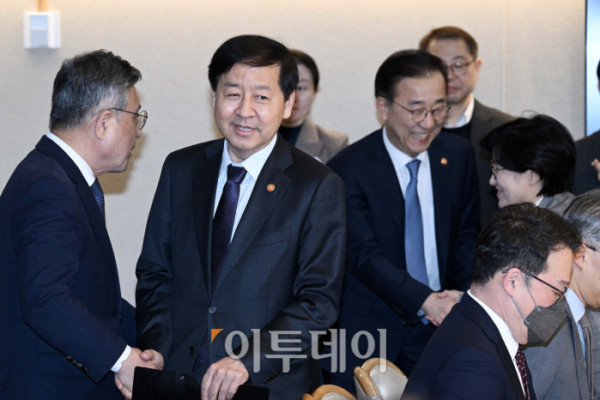 ▲구윤철 경제부총리 겸 기획재정부 장관과 김윤덕 국토교통부 장관이 14일 서울 종로구 정부서울청사에서 열린 주택공급촉진 관계장관회의에서 참석자들과 인사를 나누고 있다. 이날 회의에서는 주택공급촉진 관계장관회의 운영계획과 주택시장 동향 및 주택공급 관련 협조 요청사항이 논의됐다. 조현호 기자 hyunho@