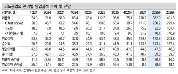 ▲리노공업 영업실적 추이. (출처=신한투자증권)