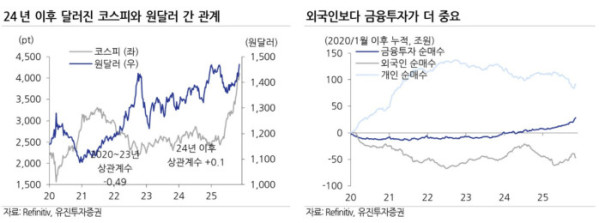 원화 가치 하락은 외국인 투자자들에게 부정적 요인으로 평가돼 왔다. 허재환 유진투자증권 연구원은 "그러나 2024년 이후 국내 주가와 원·달러 환율 간 관계가 변화하고 있다. 일본 증시가 엔저 환경 속에서도 강한 흐름을 보였던 것과 유사하게 최근 원·달러 상승(원화 가치 하락)이 국내 주식시장에 치명적인 악재로 작용하지 않고 있다"고 설명했다.