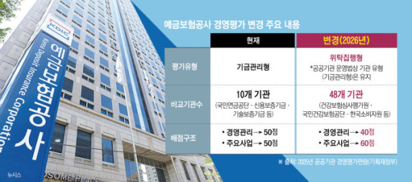 문제는 평가 기준이 훨씬 깐깐해졌다는 점이다. 기재부가 9월 공개한 '2025년 공공기관 경영평가편람(수정)'에 따르면 내년부터 위탁집행형 평가를 받는 예보의 평가 비교기관은 기존 10개에서 48개로 대폭 늘어난다.