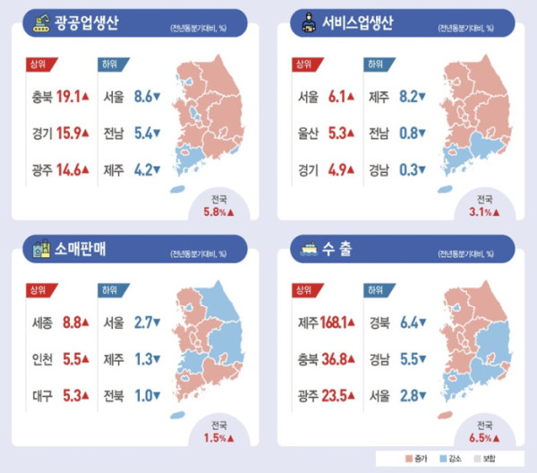 반면, 지방은 서비스업이 약세다. 전남·경남·제주 등 3개 시·도는 서비스업생산이 ‘마이너스’를 기록했다. 대구·강원·충남·전북·경북도 증가율이 1%대에 그쳤다. 지방은 대체로 제조업 의존도가 높다. 대구·광주·경기·충북은 3분기 광공업생산이 각각 9.0%, 14.6%, 15.9%, 19.1% 증가했다. 수출도 대구는 14.2%, 광주는 23.5%, 경기는 11.9%, 충북은 36.8% 늘었다.