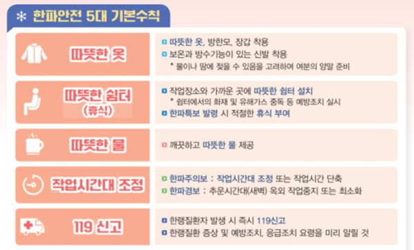먼저 한랭질환 산업재해가 빈번하게 발생하는 업종에서 3만 개소를 선정해 한파특보 등 기상 상황과 한파 재해사례를 전파하고, ‘한파 안전 5대 기본수칙’을 준수하도록 지도·점검한다. 건설·환경미화 노동자, 특수형태근로종사자, 배달종사자 등 취약 업종에 대해서는 핫팩과 귀덮개 등 한랭 예방 보조용품을 지원한다. 한파주의보 발령 시에는 건설·환경미화 작업시간을 오전 6시에서 9시로 조정하고, 한파경보 발령 시 옥외작업을 최소화하도록 지도할 계획이다.