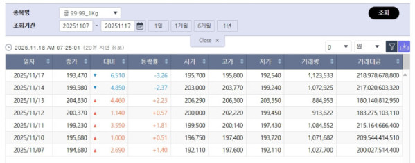 이달 들어 국내 금 가격은 등락을 반복하며 변동성이 확대되는 모습이다. 이번 주 들어 1kg 금은 13일 20만4830원까지 올라섰다가 이후 14일 19만9980원(-2.37%), 17일 19만3470원(-3.26%)으로 내려앉으며 나흘간 약 1만1000원 넘게 하락, 변동폭이 확대됐다.