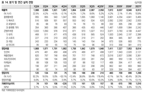 내년 매출액은 8조9490억 원, 영업이익은 9960억 원으로 예상했다. 임 연구원은 “인건비 부담 완화와 톡비즈 광고 성장세 회복에 따른 영업 레버리지 효과가 본격화함에 따라 영업이익은 컨센서스를 20% 상회할 것으로 예상한다”고 설명했다.