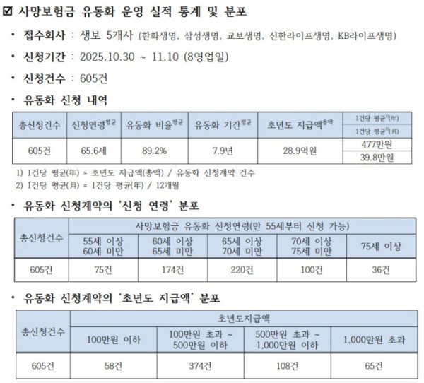 지난달 도입된 ‘사망보험금 유동화 제도’가 출시 첫 주부터 빠르게 안착하고 있다. 생명보험협회는 18일 “생명보험 5개사가 해당 제도를 시행한 뒤 8영업일 동안 총 605건이 접수됐다”고 밝혔다. 초년도 지급액은 28억9000만 원으로, 1건당 평균 지급액은 약 477만 원(월환산 39만8000원) 수준이다.