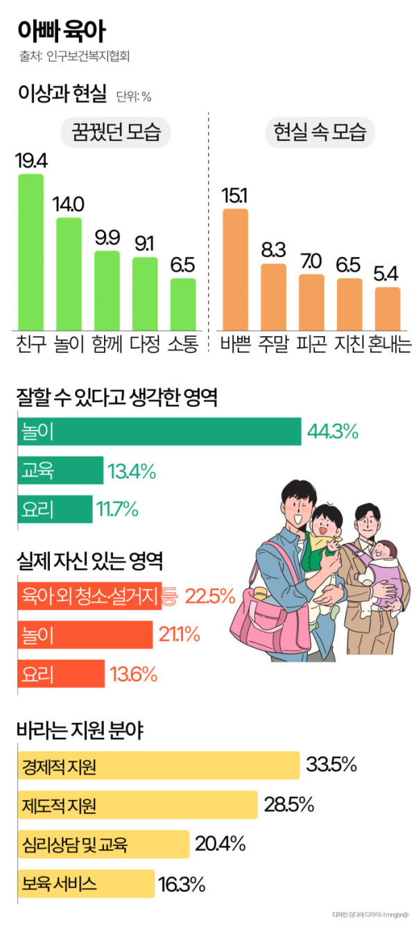 아빠들이 육아 전 꿈꿨던 모습은 '친구 같은 아빠'였지만, 현실은 '바쁜 아빠'인 것으로 나타났다.