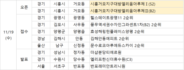 또 경기 광명시 '힐스테이트광명11(가칭)', 김포시 '풍무역세권수자인그라센트1차', 양평군 '효성해링턴플레이스양평', 경남 김해시 '김해안동에피트', 울산 남구 '문수로코아루에듀스카이' 등 단지에서 2순위 청약 접수를 실시한다.