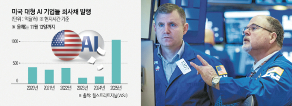 이렇게 올해 미국 기업들이 AI 관련 인프라 프로젝트에 자금을 대기 위해 발행한 회사채 규모는 2000억 달러가 넘는다. 빅테크는 그중 절반 이상 비중을 차지했다. JP모건은 자금 조달 열풍에 내년 미국 회사채 발행 규모가 사상 최대인 1조8000억 달러에 달할 것으로 전망했다.