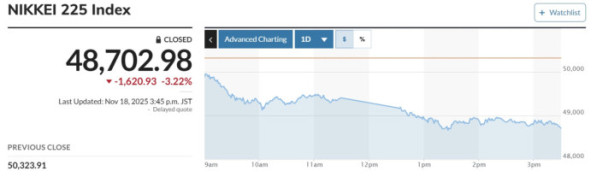 마켓워치에 따르면 일본 증시 대표 주가지수인 닛케이225 평균주가(닛케이)는 전 거래일 대비 1620.93엔(3.22%) 내린 4만8702.98엔으로 마감했다. 기술주 중심의 토픽스는 96.43포인트(2.88%) 하락한 3251.10에 거래를 마쳤다.