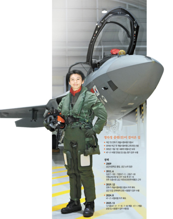 정 중령(진)은 내년부터 우리 공군에 실전 배치될 한국 최초 국산 전투기 KF-21의 개발시험비행 조종사 8명 중 한 명이다. 2019년 개발시험비행 교육과정에 여군 최초로 선발됐다. 그는 현재 비행 안정성 및 성능 평가라는 전력화의 마지막 관문을 책임지고 있다.